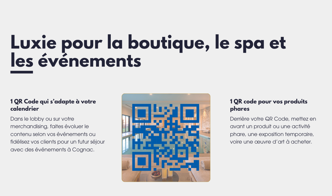 Dans le lobby, la boutique ou le spa, un QR Code évolutif valorise vos produits, événements ou œuvres à vendre, tout en fidélisant pour un prochain séjour.