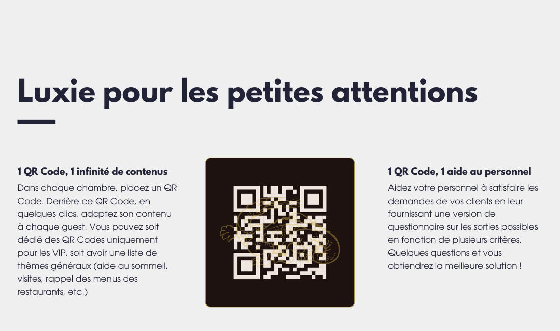 Dans chaque chambre, un QR Code Luxie permet d’offrir une attention personnalisée : aide au sommeil, suggestions de visites, menus… adaptez le contenu à chaque profil de client.